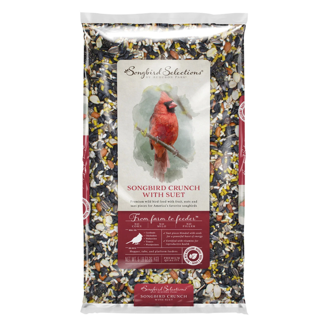 Contains Suet pieces blended with seeds for a powerful boost of energy, fortified with vitamins for reproductive health. Ideal blend for cardinals, chickadees, nuthatches, titmice and woodpeckers. Contains sunflower, safflower, peanuts, raisins, dehydrated cherries, calcium carbonate, wheat flour, rendered beef suet, glucose, natural colors, mineral oil, flaxseed oil, vitamin A & E supplement, riboflavin, D- calcium pantothenate, vitamin B-12 supplement, biotin and roughage products. Crude protein 14 %, crude fat 29.25% and crude fiber 28%.