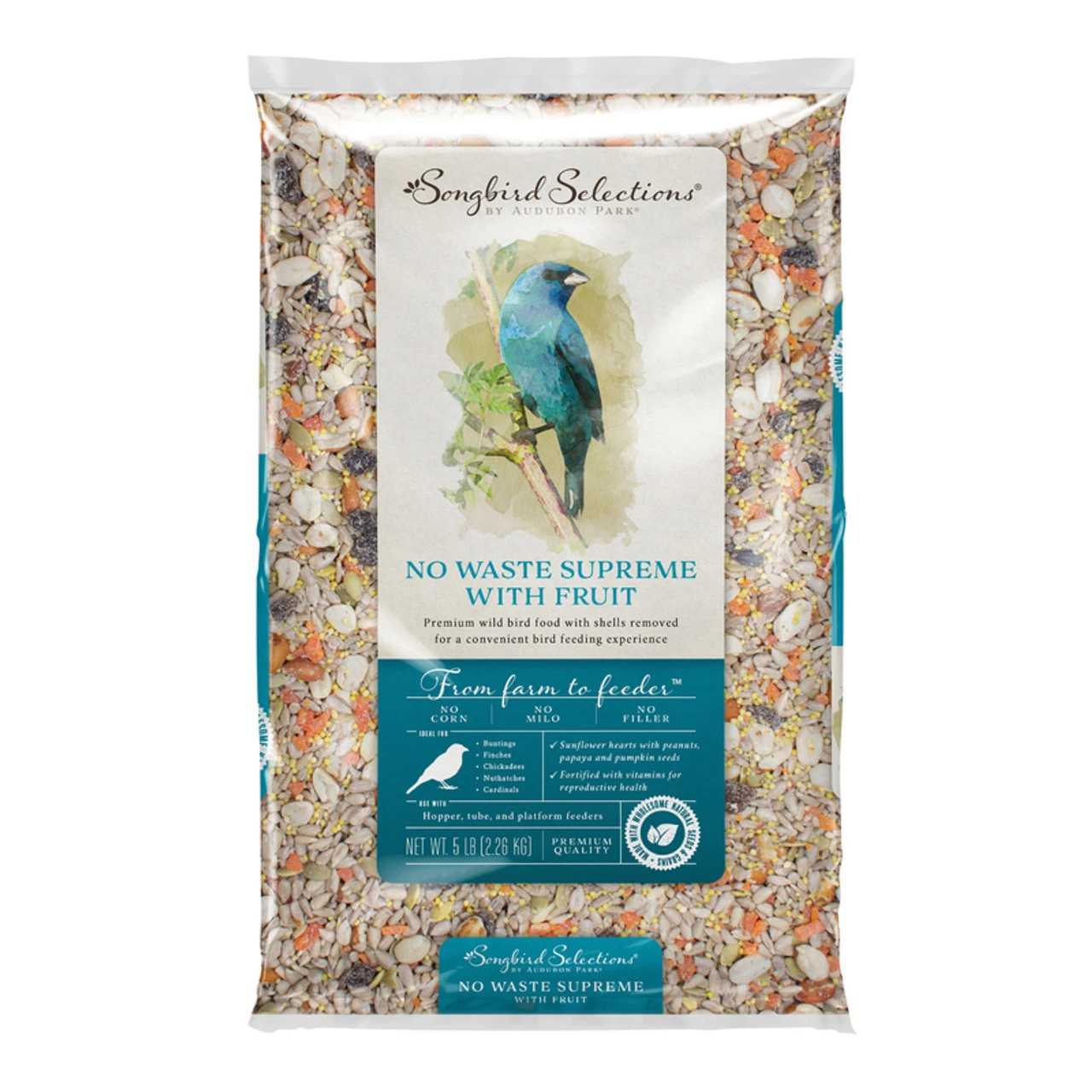 Contains sunflower hearts with peanuts, papaya and pumpkin seeds. Fortified with vitamins for reproductive health. Ideal blend for buntings, finches, chickadees and cardinals. No Waste Supreme with Fruit wild bird food has shells removed for a convenient bird feeding experience. Contains Niger seed, sunflower kernals, millet, calcium carbonate, mineral oil, flaxseed oil, mixed tocopherols, vitamin A & E supplements, riboflavin, D- calcium pantothenate, vitamin B 12 supplement, biotin and roughage products. Crude protein 19%, crude fat 38.50%, crude fiber 21%.