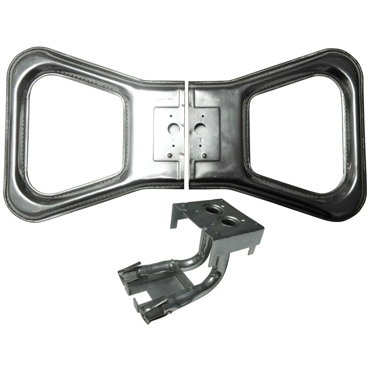 17 Inch stainless steel Broilmaster “Bowtie” burner. Fits “P3X and P4X” models. IMPORTANT: Model Years 2011 And Newer. Dimensions 9-1/2″ X 17″. Venturi tube drop (distance from the bottom of the burner to the bottom of the tubes) is 2-7/8″. Venturi tube reach (distance from the end of the venturi tube to the center line of vertical pipe) is 6-3/4″. Features air adjustment shutters and spider screens on venturi pipe ends. Gasket, screws and installation instructions included. Minor Assembly Required.