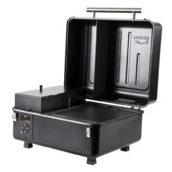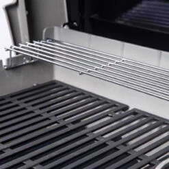 Charcoal grillers will love the Char-Broil barrel grill. You can grill for an army with 568 square inches of cooking space. It features adjustable fire grates, dampers, and a removable ash pan. The grates are cast iron, which is great for searing. It also has a swing-a-way warming rack, a temperature gauge, and a handy side shelf. Move the grill quickly with rolling casters.