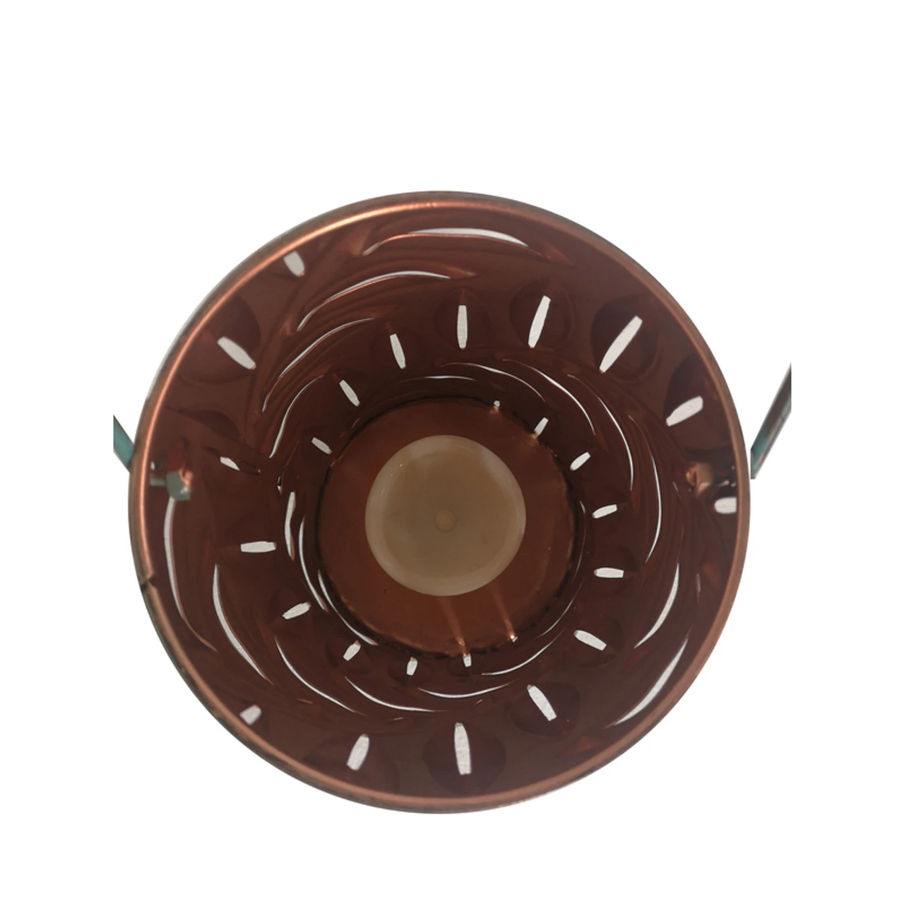 Unique metal lantern with handle. Lantern features fern leaves cut into the metal in a very artistist design. The LED candle will add ambience to your patio, deck, sunroom, porch, or even indoors. Lovely patina color.