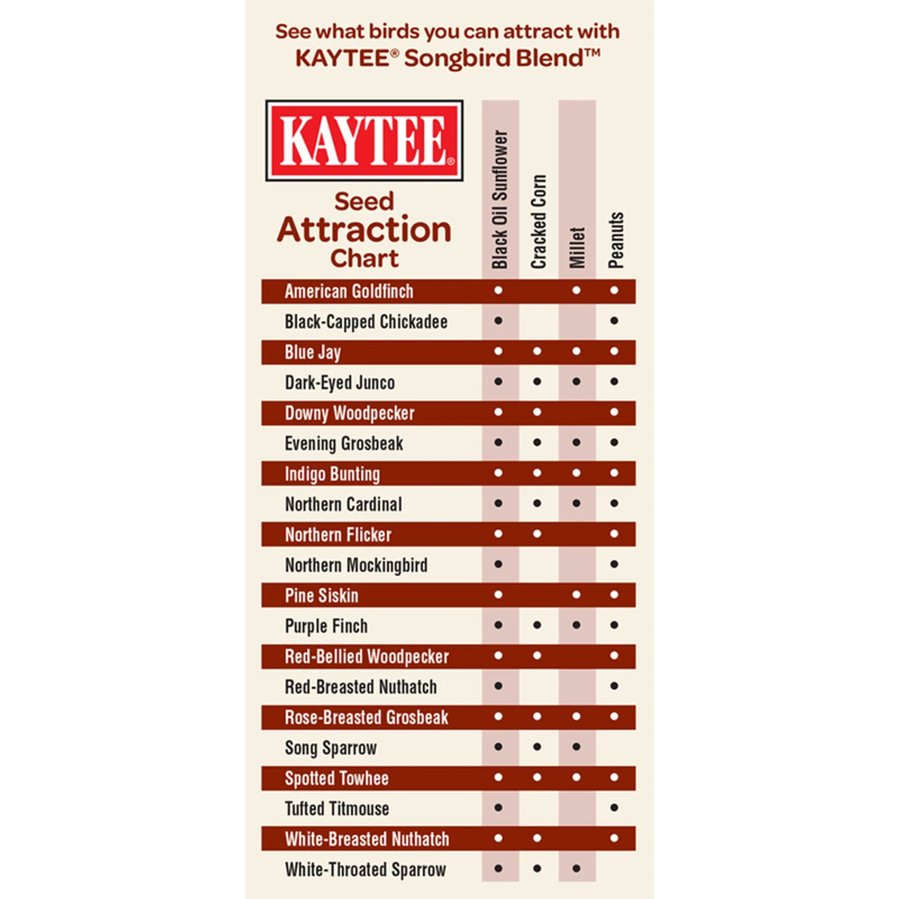 Kaytee songbird blend is one of the highest-energy wild bird foods available. This unique blend of premium seeds and grains includes peanuts to add even more energy to a mix already rich with black oil sunflower seeds. This blend is designed with the colors, contrast and seeds formulated to attract more colorful songbirds year-round. It particularly appeals to cardinals, grosbeaks, chickadees, titmice, nuthatches and more. Add this blend to your backyard feeder to listen to some beautiful tunes from your feathered friends.