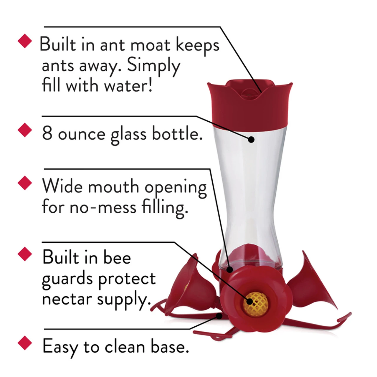 With the Perky-Pet Pinch-Waist Glass Hummingbird Feeder, entertaining hummingbirds in your backyard has never been easier. It’s the classic design that you know and love with a few great updates, including a new and improved wide-mouth bottle and bird-preferred U-shaped perches. Meanwhile, the attention-catching color and 8 oz nectar capacity are irresistible to hummers. For your convenience, this feeder disassembles completely for effortless cleaning. Remove the ant moat, base and bottle with ease, even the built-in bee guards come apart! In addition, the wide-mouth design makes it easy to access hard-to-reach spots of the bottle, while also allowing for mess-free filling. The Perky-Pet Pinch-Waist Glass Hummingbird Feeder also features convenient insect defenses. The bee guards keep bees at bay, while hummingbirds can still easily access the nectar. To keep ants away, fill the top of the lid with water to create a barrier that prevents them from crawling down to the ports.