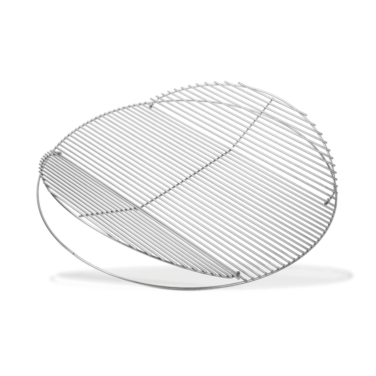Replacement cooking grate for the Weber® Ranch Kettle. This is a stainless steel grate with hinged sides, at 9:30 and 3:30 in the photo. The hinged sides are so you can add more charcoal or chunks of smoking wood. The kettle is considered a 37 inch grill, but the the cooking grate is only about 36 inches. This is the UPPER grate where you cook the food. It’s stainless steel and perhaps that’s why it costs so much more than the ranch charcoal grate. Dimensions: 0.5″H x 36.6″W x 36.6″D.