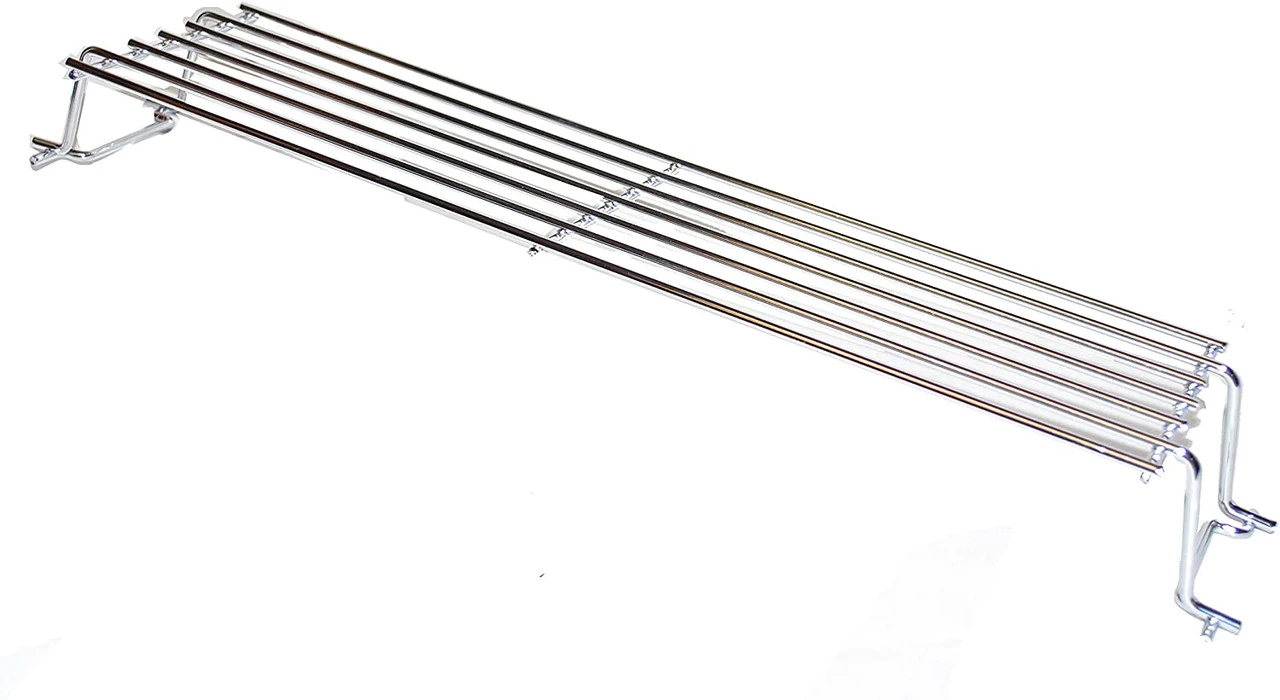 In 2009 Weber® Spirit® grills came with a raised warming rack like the 2007 and later Genesis® grills, instead of the flat-across warming rack the grills had for years (since the 1980’s?)The raised warming rack supports the food 4.75 inches (12cm) above the primary cooking surface. Swap it in and out with the flat (straight across) warming rack whenever you need more (or less) space for items on the primary cooking area!The rack is 23.75 inches long overall (where it fits into the grooves on the grill’s lower casting). It is 2.25 inches high and 4.75 inches deep. (60.4 x 2.57 x 12 cm).