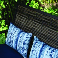 Enjoy outside in comfort with the Living Accents Navy 3-Person swing. This swing features a heavy-duty steel frame paired back polyester cushions in a beautiful navy blue color, resting against a full wicker back included with lumbar pillows for ultimate comfort and relaxation. A canopy for optimal shade will allow you to sit back and relax all summer long.